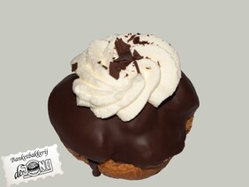 Een met roomboter gebakken soes, gevuld met Heerlijke slagroom, overgoten met pure chocolade en een royale rozet slagroom.
